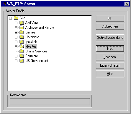 Nach dem Start von WS_FTP Pro sieht man die Übersicht über die Serverprofile